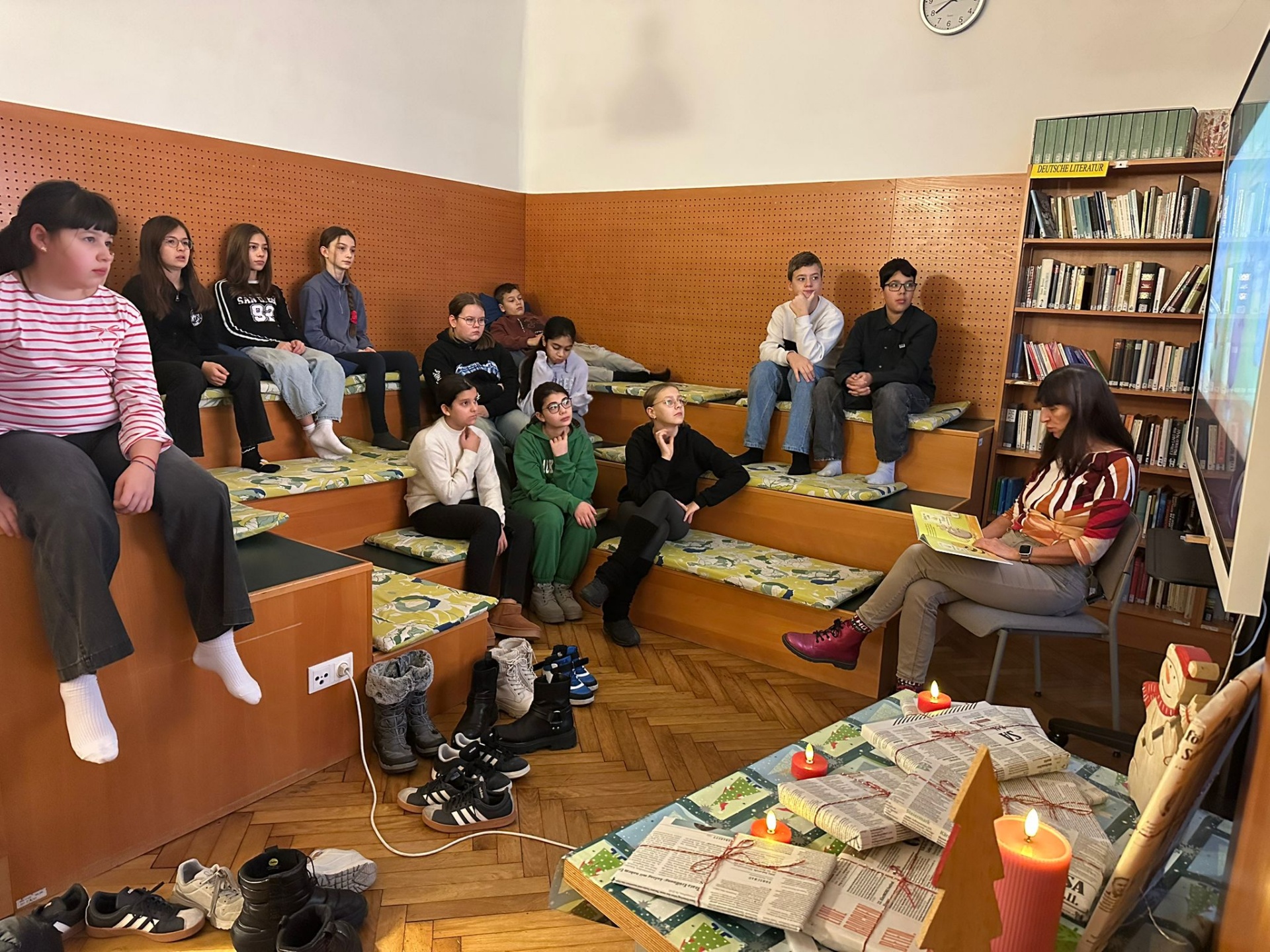 Dazu wurden Bilderbücher digitalisiert und über das Smartboard visualisiert. Kurz vor Unterrichtsbeginn konnten sich die Schüler:innen in einer gemütlichen und weihnachtlich geschmückten Bibliothek auf die Adventszeit einstimmen. Zum Abschluss gab es noch für alle, die wollten Büchergeschenke!