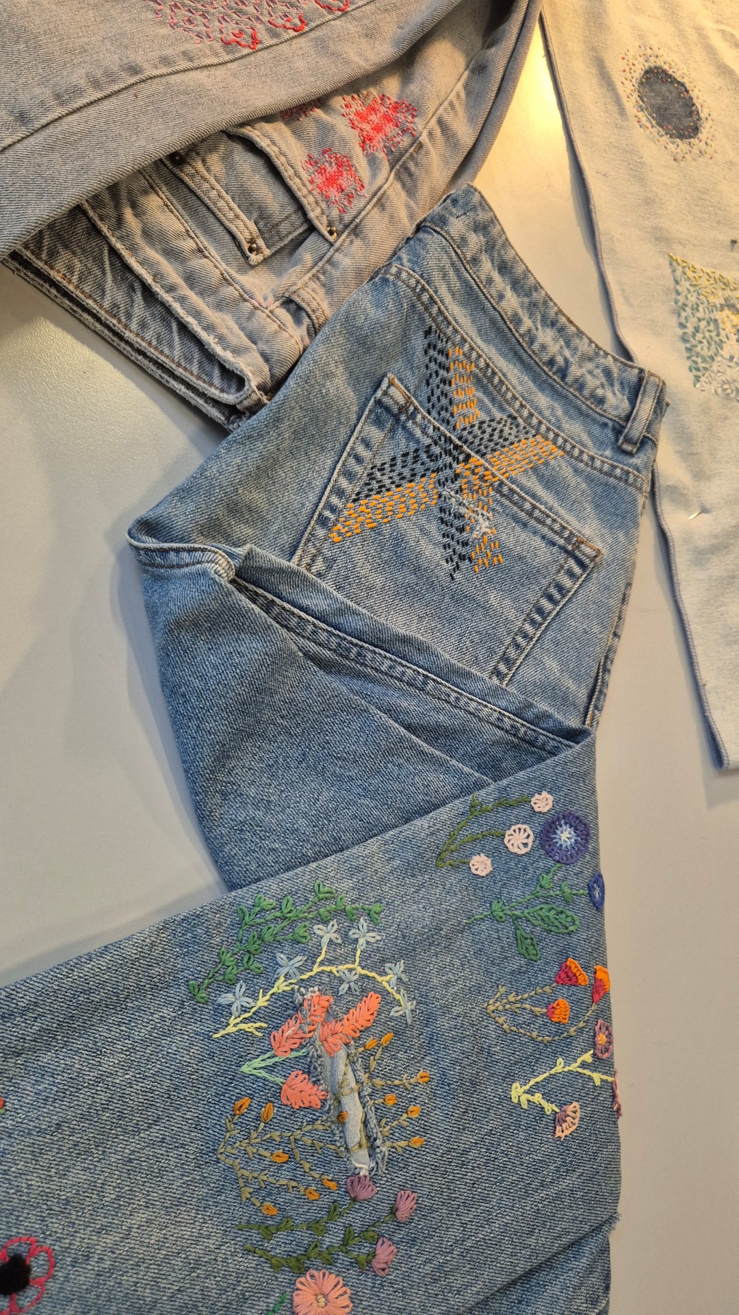 Im praktischen Teil lernten wir die Technik des Visible Mending kennen. Ziel dabei ist es, Kleidung bewusst sichtbar zu reparieren und die Ausbesserung als gestalterisches Element zu nutzen. Ganz ohne Nähmaschine zeigten uns die Workshopleiter:innen, wie mit Nadel und Faden ein Patch angebracht wird. Auf diese Weise lassen sich Löcher ausbessern, Flecken verdecken oder Kleidungsstücke individuell gestalten.